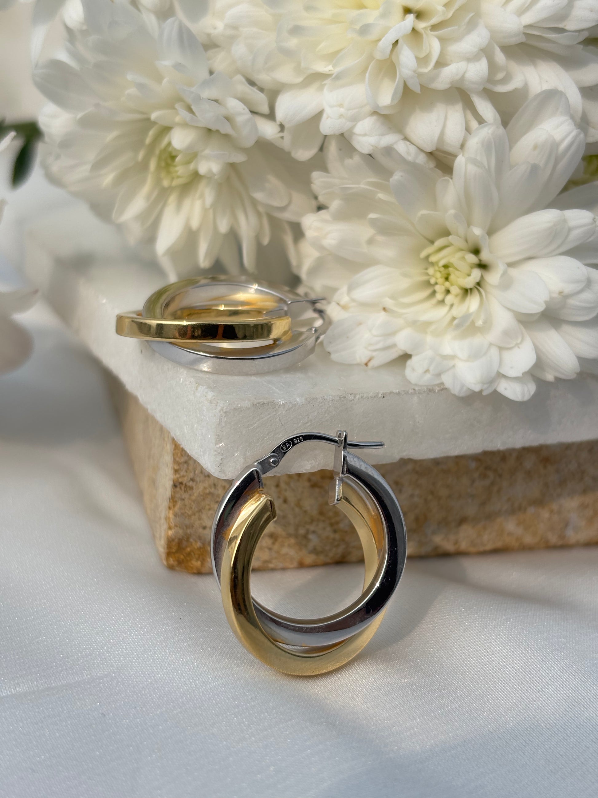 Sleek interlocked hoops blending silver and gold for effortless everyday elegance.