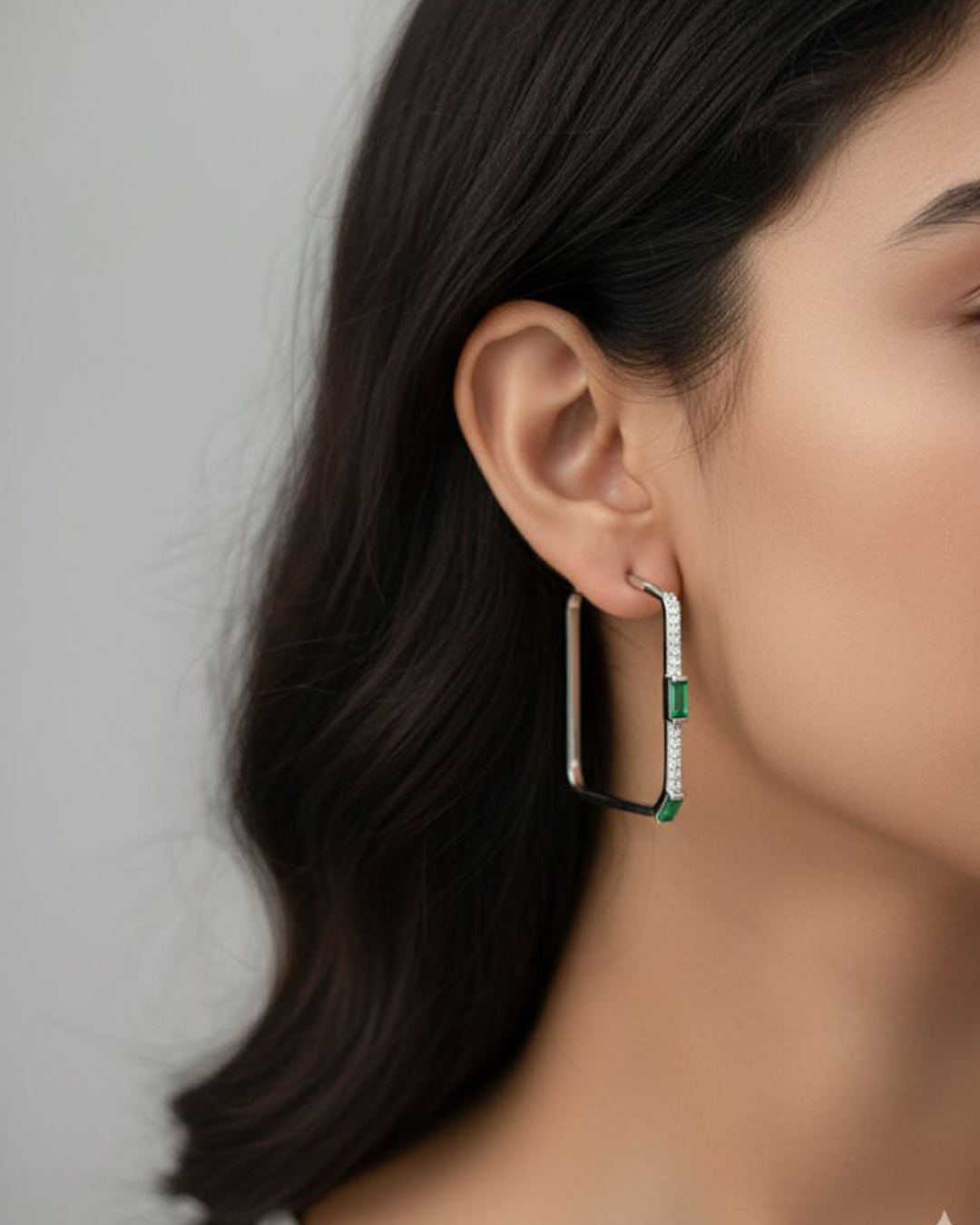 Sleek silver balis accented with emerald-green details—minimal, modern, and effortlessly striking.