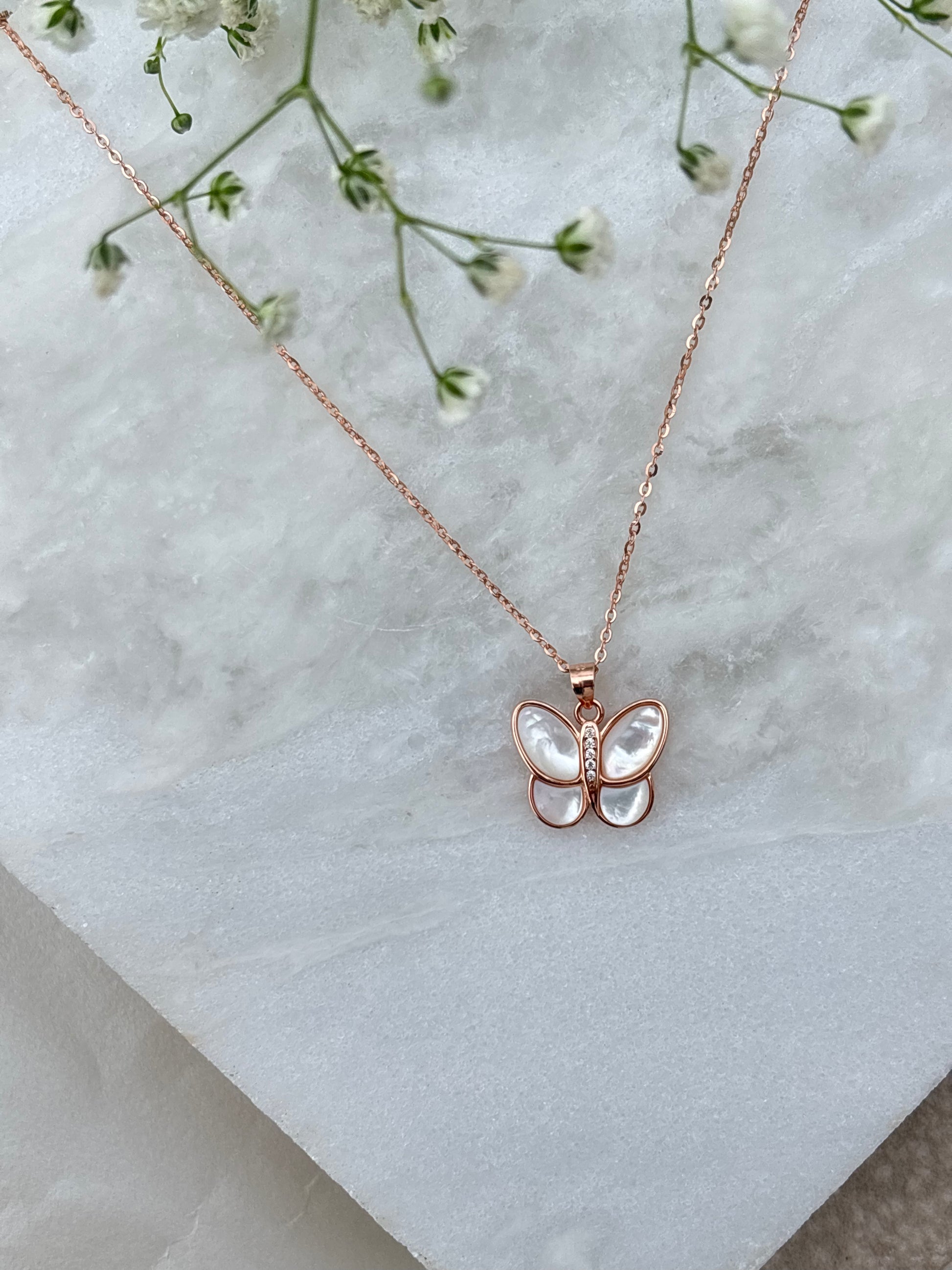 A dainty rose-gold butterfly pendant crafted with mother-of-pearl wings and sparkling stones.