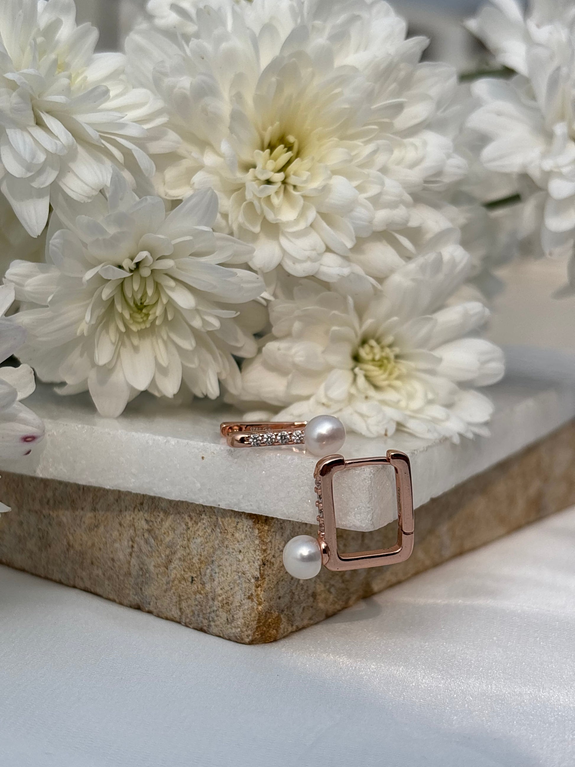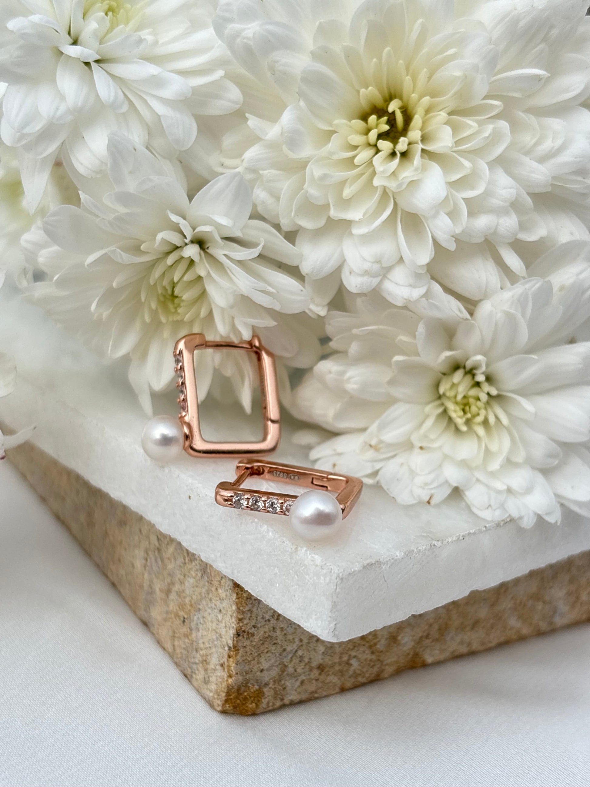 Modern rectangular hoops finished with a delicate pearl accent, blending minimal design with soft, timeless elegance.