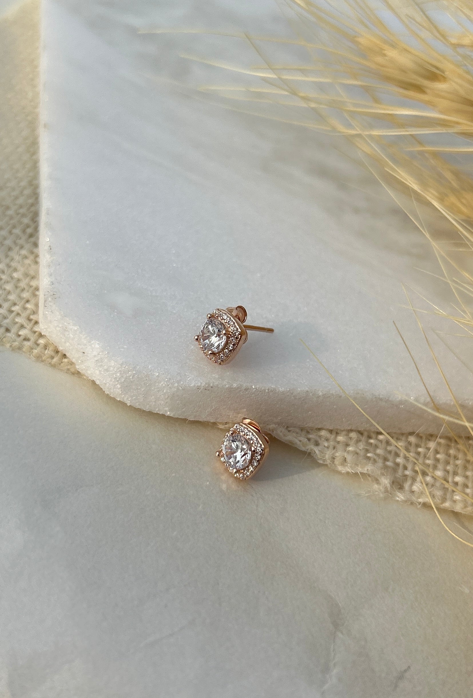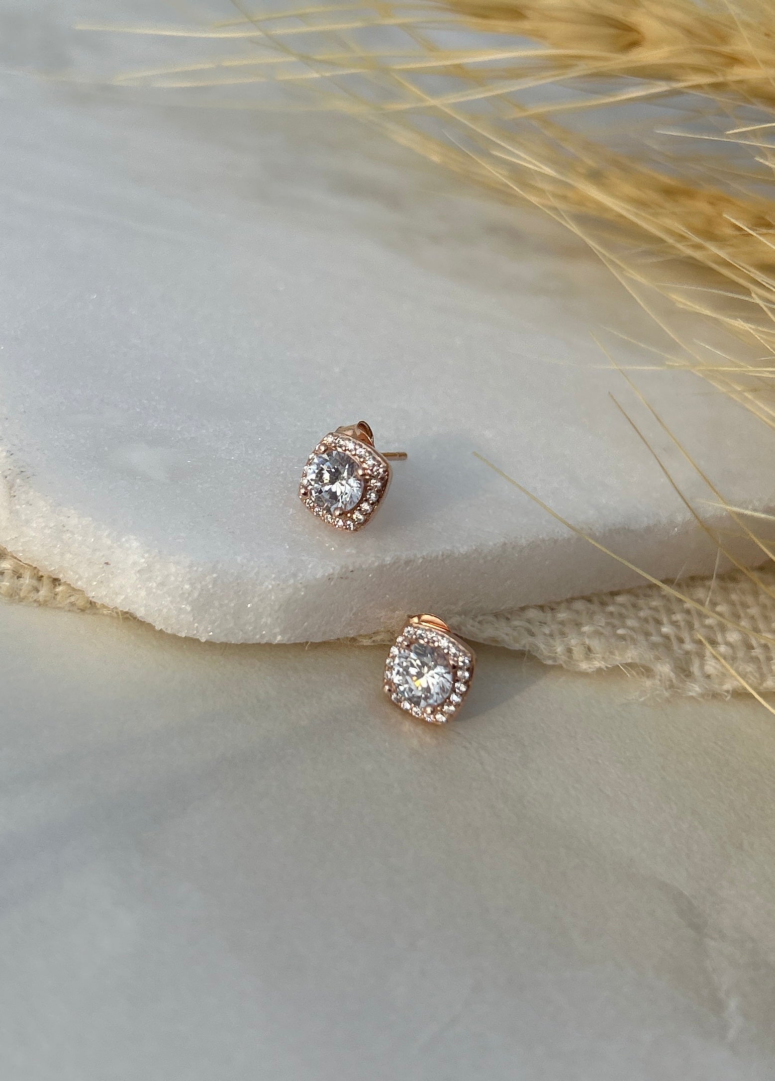 Elegant cushion-shaped stud earrings with a soft rose gold finish, designed for everyday shine.